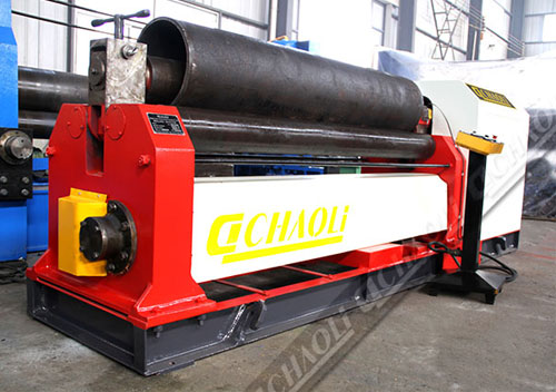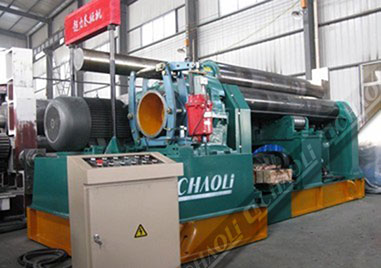 本機結構型式為三輥對稱式,上輥在兩下輥中央對稱位置作垂直升降運動,通過絲桿絲母蝸桿傳動而獲得,兩下輥作旋轉運動,通過 減速機的輸出齒輪與下輥齒嚙合,為卷制板材提供扭矩。本機床的缺陷是需借助其它設備實現預彎。